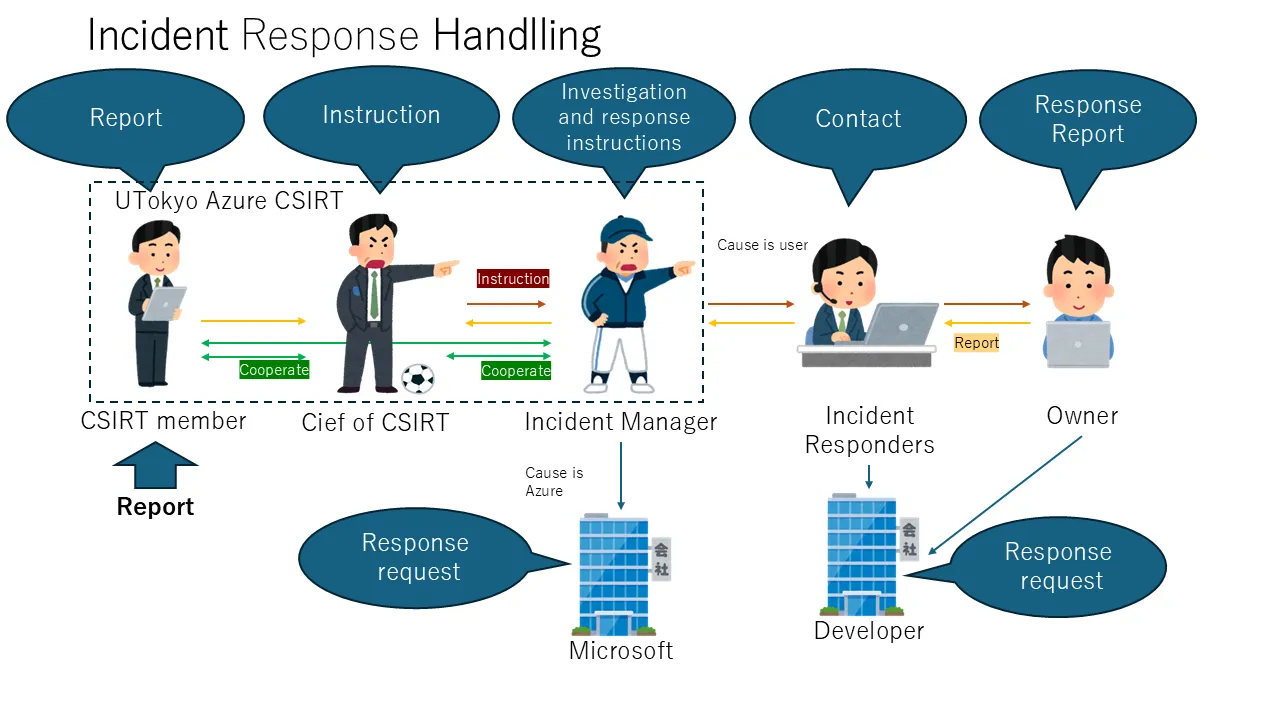 The process for responding to incidents accepted by UTokyo Azure CSIRT is mainly as follows: