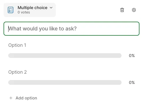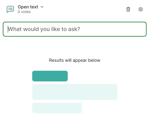 • Survey - Create a survey combining multiple questions (unlike the above 6 types, participants answer multiple questions collectively as one set).