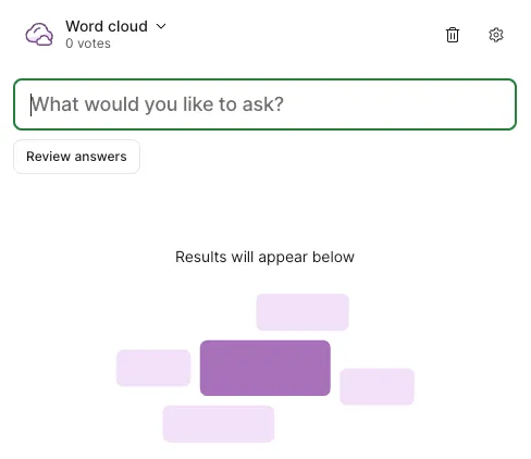 • Word cloud - Answers to questions are visualized as a “cloud” (participants answer in a short text form same as in Open text).
