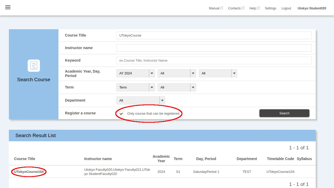 1. To find the course you wish to enroll in, use the Search Course function. If you check the “Only courses that can be registered” box, only courses that allow “self-registration” will be displayed.