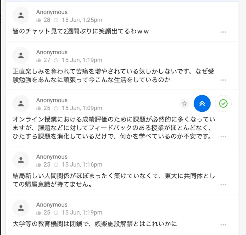 希望者だけで、6 月 19 日の夜 21:00 ~ 23:13 まで zoom に集まり、愚痴・政治・恋愛・映画といった様々なテーマで雑談をする会でした。Slido の投稿数は 1200 件にのぼり、その内容は「失恋の乗り越え方が分かりません」といったものから「常に気持ちが落ち込んでいて涙が出てきます」といったものまで多岐に渡りました。