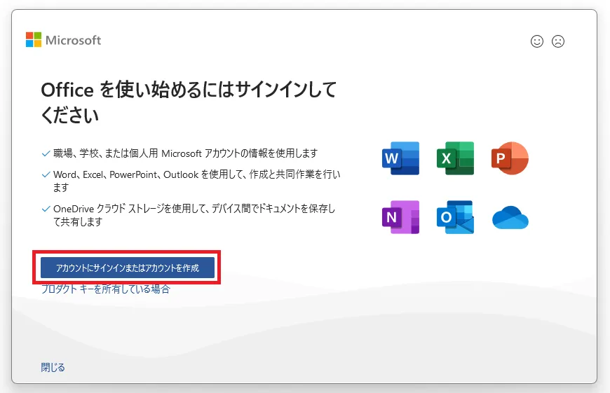 - 「Officeを使い始めるにはサインインしてください」などのダイアログが表示された場合:OfficeアプリにどのMicrosoftアカウントでもサインインしていない状態です.「アカウントにサインインまたはアカウントを作成」をクリックしてください.