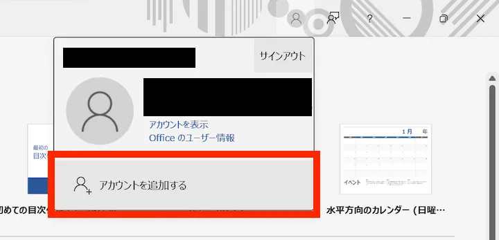 - 上記のような画面が表示されず,通常の編集画面が表示された場合:OfficeアプリになんらかのMicrosoftアカウントでサインインしている状態です.Windowsの場合は右上の人型のアイコンを、macOSの場合は左上の円形のアイコンをクリックした後,現在サインインしているアカウントを確認してください.UTokyo Accountでない別のアカウントでサインインしていた場合は「アカウントを追加する」を選択してください.