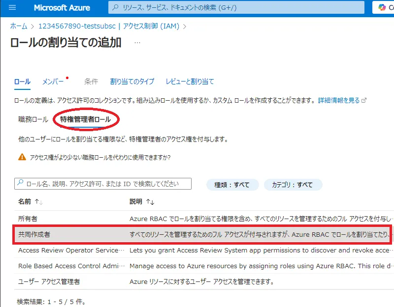 職務ロールと特権管理者ロールの2つの選択があるので,特権管理者ロールを選択してください.- 画面下に選択できるロールが一覧で表示されるので,ここでは