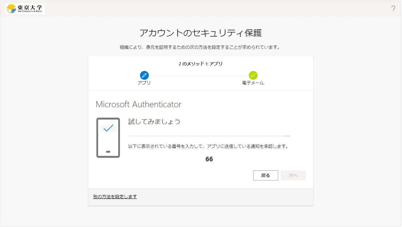 • Microsoft Authenticatorの場合:スマホに通知が送られ,サインイン画面に表示されている2桁の数字を入力するように求められるので,そのようにしてください.