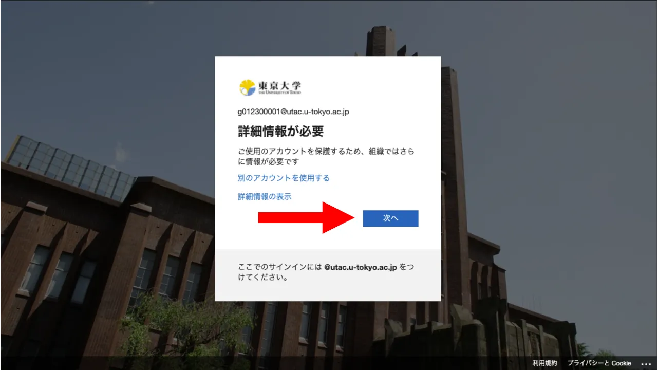 2. UTokyo Account(数字10桁の共通ID + @utac.u-tokyo.ac.jp)とパスワードを入力してログインしてください.