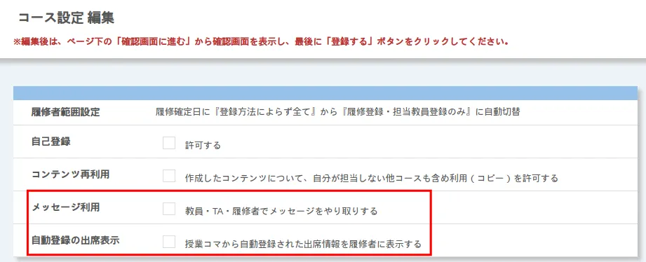 「コース設定→コース設定」1から,メッセージ機能を有効化するかどうかや,出席情報を表示するかどうかを設定することができます.