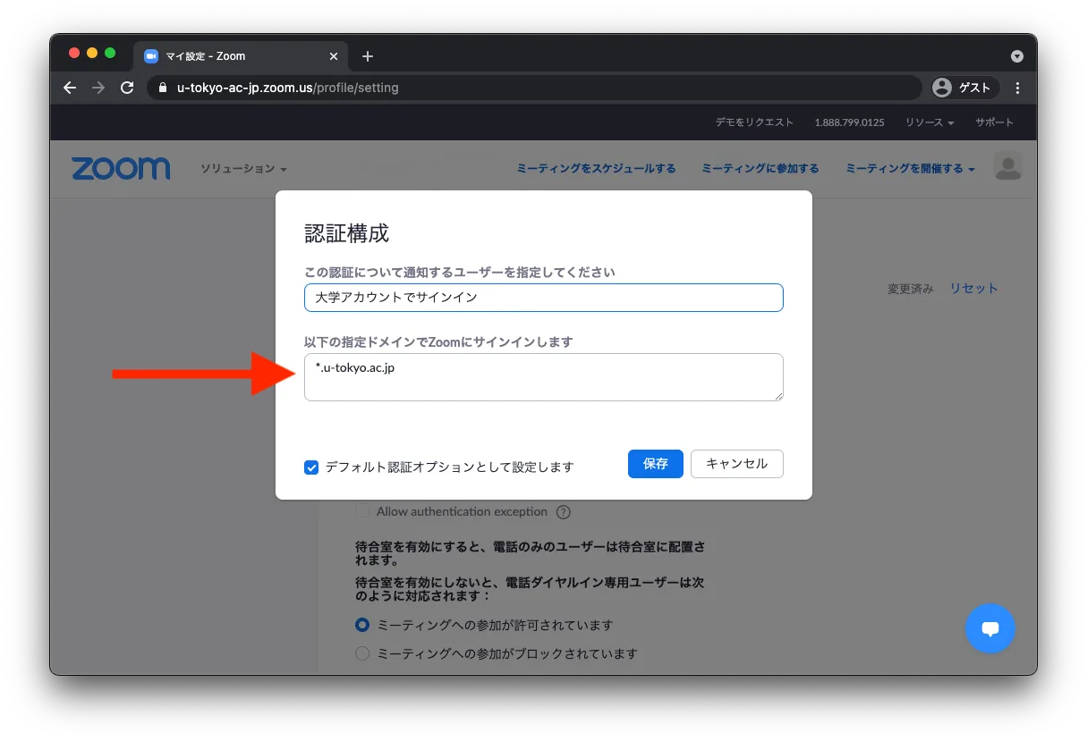 2021年春のシステム変更後,東京大学のZoomアカウントは @utac.u-tokyo.ac.jp に変更されました.このため,これまでドメインの設定を g.ecc.u-tokyo.ac.jp としていた場合,そのままの設定では東京大学のアカウントに正しくサインインしているユーザが会議室に入れなくなります.必ず上記の通り *.u-tokyo.ac.jp に変更してください.