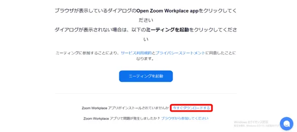 2. Zoomのアプリがインストールされていない場合は,自動的に必要なファイルがダウンロードされるか,ダウンロードされない場合は以下のような画面が表示され,「今すぐダウンロードする」を押すと必要なファイルをダウンロードできます.