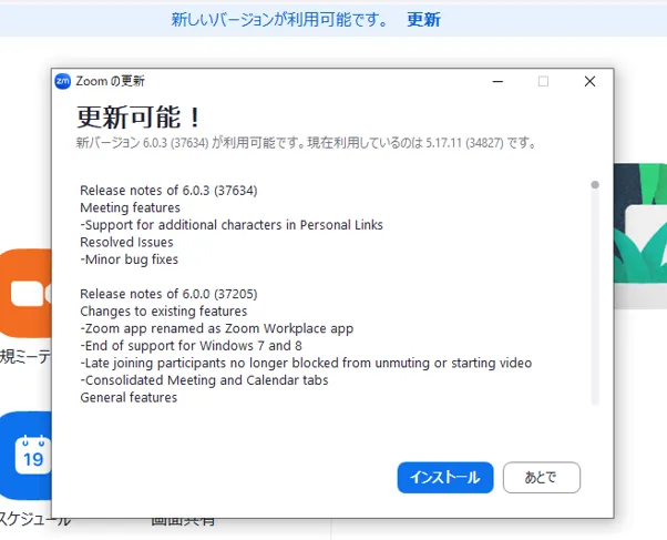 Zoomのアプリは定期的に新しいバージョンが提供され,新機能の追加や不具合の修正が行われています.また,特定のバージョンより古いZoomのアプリは利用できなくなることがあります.Zoomのアプリをより安全に,快適に利用するために定期的にアップデートを行ってください.