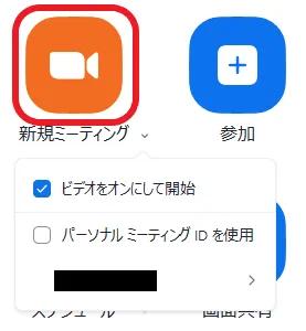 2. 「新規ミーティング」を押してください.このとき使われるミーティングIDには,ランダムなミーティングID(数字11桁)と,「パーソナルミーティングID(数字10桁)」の2種類があります.デフォルトでは,ランダムなミーティングIDが毎回新たに生成され,ミーティング終了後すぐに無効になります.一方で,パーソナルミーティングIDを利用したい場合は「新規ミーティング」の横にある「∨」を押して「パーソナルミーティングIDを使用」にチェックを入れてください.